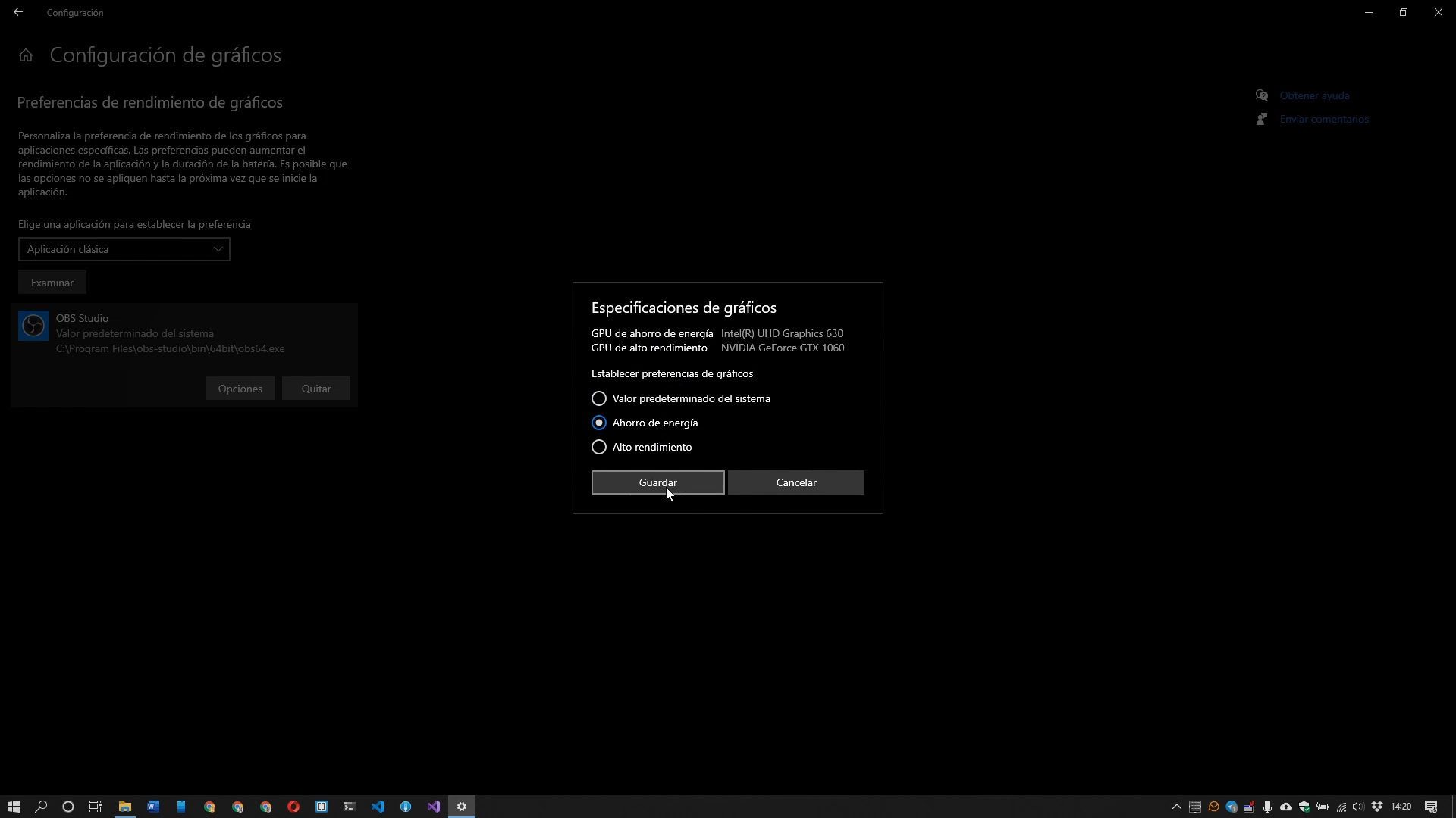 Botón derecho en icono abajo la izquierda de Windows → Configuración → Dispositivos → Configuración de pantalla → Configuración de gráficos.